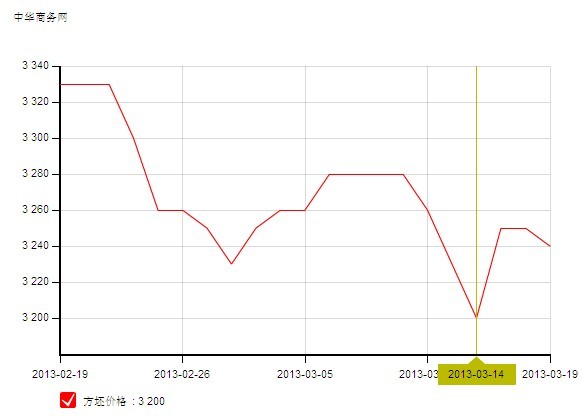 下圖為2013年2月19日-3月19日唐山鋼坯價格走勢圖,在這一個月的時間里,唐山鋼坯價格徘徊在漲跌之間,總體以下滑為主,最低價格為3月14日的3200元/噸。今日價格為3240元/噸,與2月19日相比,降幅為60元。