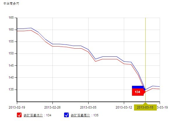 下圖為2013年2月19日-3月19日印度礦價格走勢圖,從圖中可以明顯的看出,在這一個月的時間里,印度礦以下滑為主,最低價格為3月15日的134美元/噸。今日印度礦價格為135.25-136.25美元/噸,與2月19日相比,降幅為24.25美元/噸,合計人民幣約為150.7元。