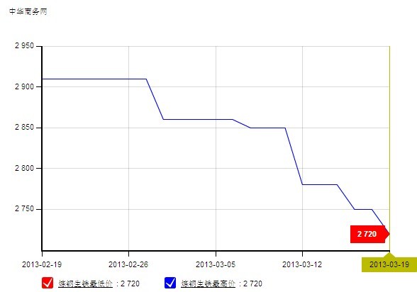 下圖為2013年2月19日-3月19日唐山煉鋼生鐵價格走勢圖,從圖中可以看出,自2月19日之后,唐山煉鋼生鐵價格一路跌跌撞撞下滑,降幅高達190元/噸。春節(jié)剛過的時候,唐山煉鋼生鐵價格出現(xiàn)了一波上漲行情。