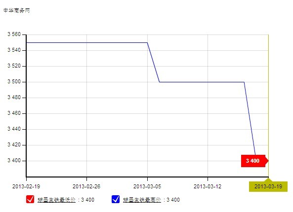 下圖為2013年2月19日-3月19日河北冀州地區(qū)球墨鑄鐵價格走勢圖,近一月時間該地區(qū)生鐵價格以下滑為主,降幅為150元/噸,現(xiàn)報價3400元/噸。