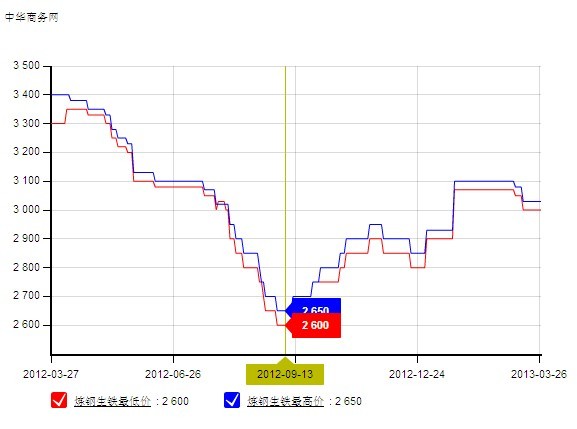 下圖為2012年3月27日-2013年3月27日山東淄博地區(qū)煉鋼生鐵價(jià)格走勢圖,在近一年的時(shí)間里,最低點(diǎn)價(jià)格為2013年9月13日的2600-2650元/噸,目前淄博地區(qū)煉鋼生鐵價(jià)格為3000-3030元/噸,基本與去年8月2號(hào)左右持平,同比降幅為10%,去年同期價(jià)格為3300-3400元/噸。