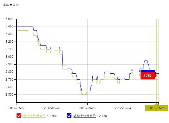 下圖為2012年2月27日-2013年3月27日襄汾地區(qū)煉鋼生鐵價(jià)格走勢圖,在近一年的時(shí)間里,最低點(diǎn)價(jià)格為2012年9月10日的2500-2550元/噸,目前襄汾地區(qū)煉鋼生鐵價(jià)格為2750-2780元/噸,與去年8月15號(hào)左右持平,同比降幅為17.83%,去年同期價(jià)格為3330-3400元/噸。