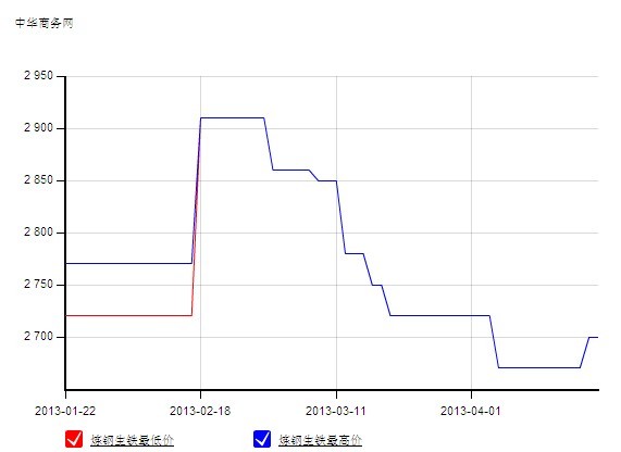 下圖為2013年1月22日-4月24日唐山地區(qū)煉鋼生鐵價格走勢圖(此圖來自中華商務(wù)網(wǎng)數(shù)據(jù)庫,直接調(diào)。瑩(jù)了解,自2月17日到至今,唐山煉鋼生鐵價格由2720-2770元/噸降至2680-2700元/噸,降幅為40-70元。另外據(jù)中華商務(wù)網(wǎng)數(shù)據(jù)顯示,自2月17日到至今,唐山地區(qū)鋼坯價格由3310元/噸將至3230元/噸,降80元;唐山Fe66%鐵精粉價格由1150-1160元/噸降至1090-1100元/噸,降60元;唐山二級冶金焦由1720-1750元/噸降至1430-1450元/噸,降290-300元/噸。就以上數(shù)據(jù)來分析,唐山煉鋼生鐵價格降幅與鋼坯、鐵精粉相差不大,唯一差別最大的是焦炭,按0.5的焦比來算,唐山煉鋼生鐵價格仍有下滑風(fēng)險。
