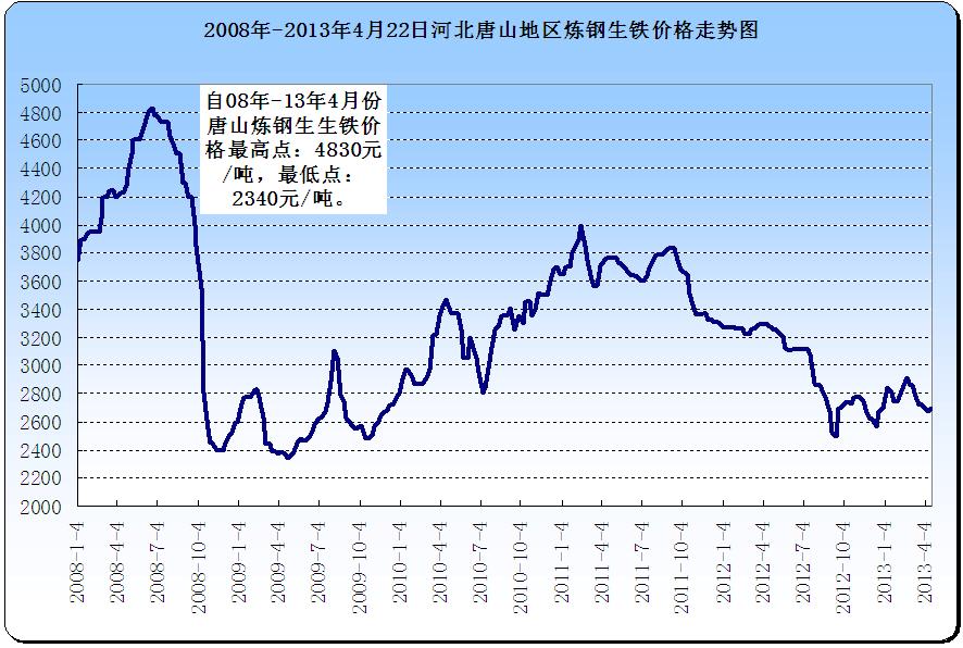 下圖為2008年1月8日-2013年4月22日河北唐山地區(qū)煉鋼生鐵價格走勢圖,從圖中可以明顯的看出,在這5年多的時間里,唐山煉鋼生鐵價格最高價為08年6月20日的4830元/噸,最低價為09年4月24日的2340元/噸。而目前價格為2690元/噸,與最高價相比,低2140元/噸,與最低價相比,高350元/噸。