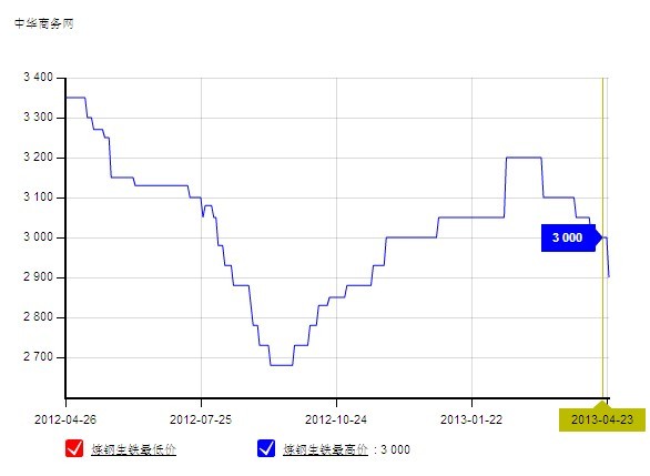 下圖為2012年4月26日-2013年4月26日濟(jì)南地區(qū)煉鋼生鐵價(jià)格走勢圖(此圖來自中華商務(wù)網(wǎng)數(shù)據(jù)庫),現(xiàn)報(bào)價(jià)2800元/噸(現(xiàn)款),與去年同期相比下滑16.41%,去年同期價(jià)格為3350元/噸(現(xiàn)款)。