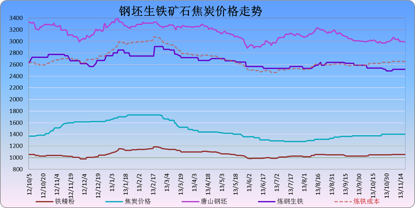 2013年經(jīng)濟(jì)穩(wěn)增長(zhǎng)政策出臺(tái),鋼市在沒有較大利好的提振下,維持震蕩格局,以鋼坯為例,基本維持在2900-3300元/噸左右。三中全會(huì)前鋼市的快速拉漲僅維持了一周就掉頭回調(diào),11月初報(bào)價(jià)在2990元,至8日價(jià)格上漲至3070元,至15日回調(diào)至2990元,本周鋼坯價(jià)格小幅震蕩,報(bào)價(jià)暫穩(wěn)。原料成本支撐價(jià)格回落空間有限,但反彈仍缺乏需求支撐。臨近年底,鋼市淡季愈發(fā)顯現(xiàn),價(jià)格難漲,大多數(shù)鋼材產(chǎn)品價(jià)格不斷走低,往年低價(jià)市場(chǎng)冬儲(chǔ)行情會(huì)穩(wěn)定市場(chǎng)情緒,但今年下游市場(chǎng)、貿(mào)易商似乎冬儲(chǔ)意愿不強(qiáng),或?qū)δ旰笮星椴豢春,或企業(yè)資金緊張,故整個(gè)鋼鐵以及原料市場(chǎng)都是一片蕭條。礦石、焦炭市場(chǎng)略好于下游產(chǎn)品,價(jià)格小幅看漲,報(bào)價(jià)堅(jiān)挺,但是漲幅較往年明顯放緩,對(duì)鋼鐵市場(chǎng)形成的支撐明顯小于低迷需求的壓制。