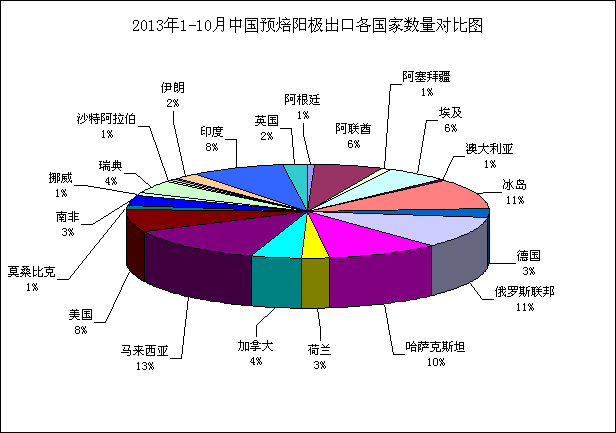 2013年10月中國(guó)預(yù)焙陽(yáng)極出口量105352噸,與去年同期相比同比增長(zhǎng)率為5%,與上月相比環(huán)比增長(zhǎng)率為16.58%。2013年1-10月中國(guó)預(yù)焙陽(yáng)極累計(jì)出口量1155292噸,與去年同期相比增長(zhǎng)率為21.77%。累計(jì)出口量創(chuàng)歷年新高,預(yù)計(jì)2013年全年預(yù)焙陽(yáng)極出口將突破130萬(wàn)噸,有可能逼近140萬(wàn)噸。