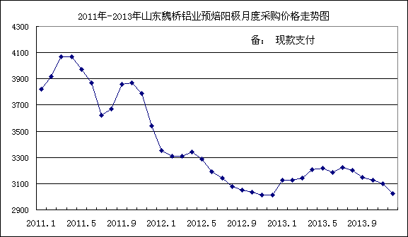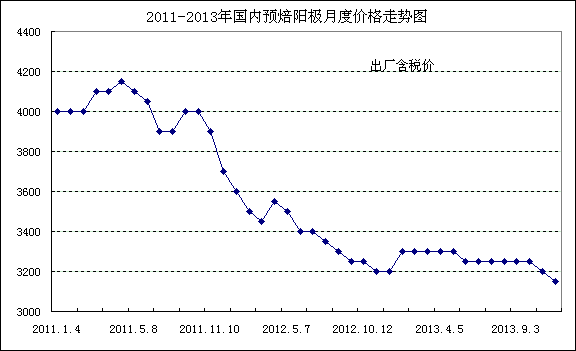 2013年前三季度預(yù)焙陽極主流出廠含稅價(jià)格基本穩(wěn)定在3200-3300元/噸,到廠含稅價(jià)在3400-3600元/噸,送到新疆鋁廠價(jià)格3900-4100元/噸。四季度受原料石油焦價(jià)格下滑和電解鋁價(jià)格回落的影響,預(yù)焙陽極主流價(jià)格下滑100-200元/噸,主流出廠含稅價(jià)格3050-3150元/噸,省外到廠到廠含稅價(jià)格3100-3550元/噸,送到新疆鋁廠價(jià)格3800-3850元/噸。