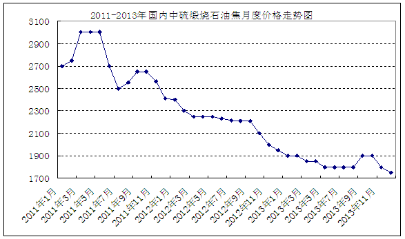 2013年原料石油焦、煅燒石油焦、改制瀝青、中溫瀝青價(jià)格去年呈短期震蕩下行,去年趨降的趨勢(shì)。
