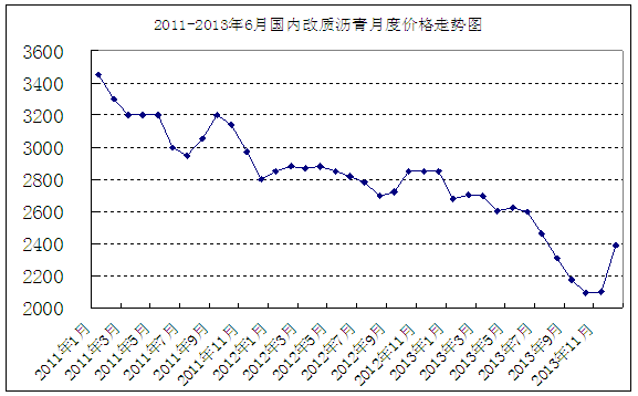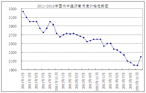 2013年國內(nèi)煤瀝青價(jià)格經(jīng)歷近11月的價(jià)格下滑,下降幅度在500元/噸左右后,終于在12月份價(jià)格實(shí)行反彈200-300元/噸,2013年底中溫瀝青市場價(jià)格2050-2350元/噸,改質(zhì)瀝青市場價(jià)格2200-2550元/噸。