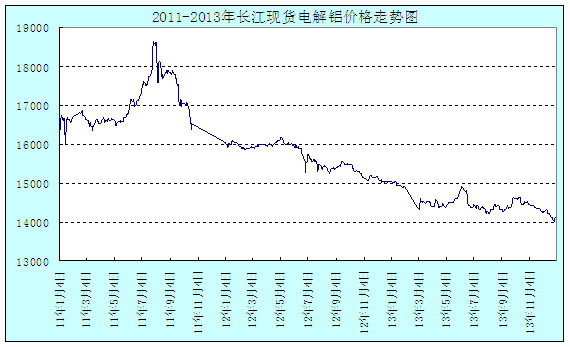 2013年電解鋁長江現(xiàn)貨價(jià)格全年下滑930元/噸,年底價(jià)格在14100元/噸收盤。電解鋁產(chǎn)量不斷增加,下游需求增加不明顯,導(dǎo)致電解鋁庫存量不斷增加,國家上半年收儲(chǔ)也不行從根本上改變電解鋁市場的現(xiàn)狀;加上2013年下半年西部地區(qū)電解鋁新增產(chǎn)能的不斷投產(chǎn)運(yùn)行更加加劇了電解鋁價(jià)格下滑的速度。