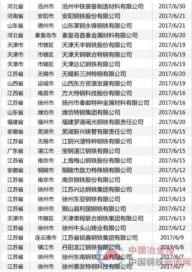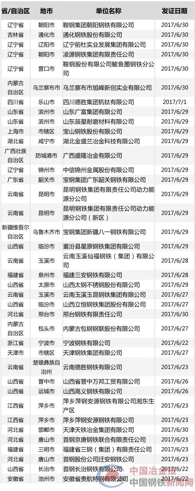 根據(jù)環(huán)保部統(tǒng)一要求,京津冀大氣污染通道城市要在今年10月底前完成鋼鐵、水泥行業(yè)排污許可證核發(fā)工作。今年上半年開始,一批鋼鐵企業(yè)陸續(xù)獲發(fā)具有全國統(tǒng)一編碼的排污許可證,截至6月30日,已有66家鋼鐵企業(yè)獲準(zhǔn)“合法排污”,這些鋼鐵企業(yè)為——