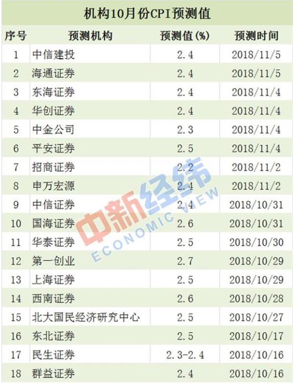 數(shù)據(jù)顯示,18家機(jī)構(gòu)對(duì)10月CPI進(jìn)行預(yù)測,僅3家機(jī)構(gòu)預(yù)測值高于2.5%,多數(shù)機(jī)構(gòu)認(rèn)為10月CPI漲幅不高于2.5%,或小幅回落。