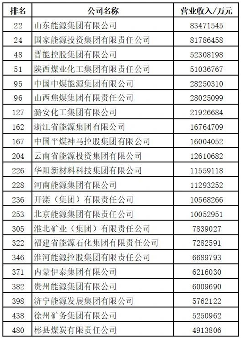 9月20日,在2023中國500強企業(yè)高峰論壇上,中國企業(yè)聯合會、中國企業(yè)家協(xié)會聯合發(fā)布了“中國企業(yè)500強”榜單。其中,有22家煤炭企業(yè)上榜,具體名單如下: