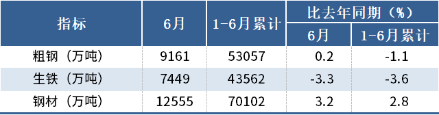 1-6月,中國(guó)粗鋼產(chǎn)量53057萬(wàn)噸,同比下降1.1%;生鐵產(chǎn)量43562萬(wàn)噸,同比下降3.6%;鋼材產(chǎn)量70102萬(wàn)噸,同比增長(zhǎng)2.8%。