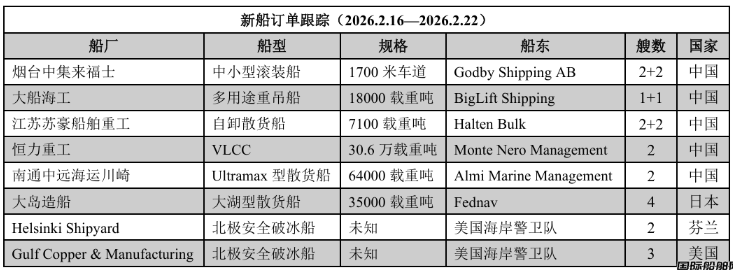 據(jù)國際船舶網(wǎng)跟蹤:2026年2月16日至2026年2月22日,全球船廠共接獲18+5艘新船訂單。其中中國船廠接獲9+5艘新船訂單;日本船廠接獲4艘新船訂單;芬蘭和美國船廠也接獲相關(guān)新船訂單。
