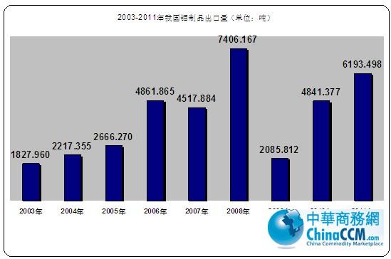 出于資源保護的目的,政府提高鉬出口門檻,在2005年取消了鉬鐵、氧化鉬的出口退稅優(yōu)惠,鉬品出口喪失價格優(yōu)勢,不少廠家轉而投向國內市場,2003年-2011年期間,我國鉬產品出口總量整體呈現(xiàn)下降趨勢。