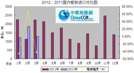 據(jù)海關(guān)統(tǒng)計(jì)數(shù)據(jù)顯示:2012年3月份國(guó)內(nèi)鈮鐵進(jìn)口1300.1噸,環(huán)比2月1864噸減少30.3%,同比去年3月也減少了65%。今年1-3月份國(guó)內(nèi)鈮鐵累計(jì)進(jìn)口4401.1噸,同比去年5613.99噸減少21.6%。
