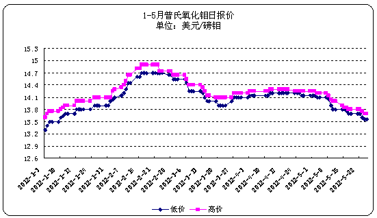 二季度國內(nèi)外經(jīng)濟形勢低迷,國外鉬市場一片黯淡,價格滑落,交易平淡,繼續(xù)維持弱市運行。進入5月份以來,國際鉬市下滑趨勢明顯,截止29日,普氏氧化鉬日經(jīng)銷價格已經(jīng)下調(diào)至13.5-13.65美元/磅鉬。