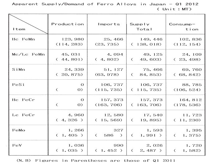 2012年第一季度日本普通鐵合金產(chǎn)品供應及表觀消費量情況如下: