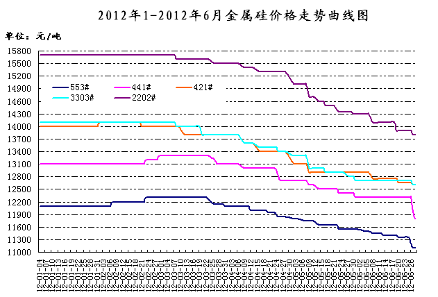 進(jìn)入2012年,面對(duì)復(fù)雜嚴(yán)峻的國際環(huán)境,大宗原材料市場(chǎng)舉步維艱,其中與金屬硅行業(yè)相關(guān)的主要表現(xiàn)為:1、企業(yè)利潤下降;2、房地產(chǎn)投資回落;3、汽車銷售趨緩;4、出口增速放緩;筆者總結(jié)以上表現(xiàn)在金屬硅行業(yè)得以體現(xiàn)。從(下圖)即2012年1-6月金屬硅價(jià)格走勢(shì)圖中可以看出,1月-3月中旬,金屬硅市場(chǎng)基本處于平穩(wěn)期,因春節(jié)前后市場(chǎng)需求不旺,多半金屬硅廠家停工歇業(yè),故市場(chǎng)價(jià)格方面有一定支撐。自3月下旬開始,金屬硅價(jià)格便步入下行通道,雖已春暖花開,但整個(gè)市場(chǎng)寒意濃濃,一方面由于終端市場(chǎng)需求沒有起色,多數(shù)業(yè)內(nèi)人士對(duì)后市并不看好,另一方面即將步入豐枯水期交替之際,市場(chǎng)觀望情緒濃厚。跌勢(shì)愈演愈烈,直至上半年結(jié)束之時(shí),價(jià)格戰(zhàn)仍未休止,而此時(shí)的金屬硅市場(chǎng)開工率也大不如前,多數(shù)生產(chǎn)廠家因市場(chǎng)過于低迷,成本偏高而不得不選擇繼續(xù)停產(chǎn)。慘淡形容上半年市場(chǎng)最合適不過。