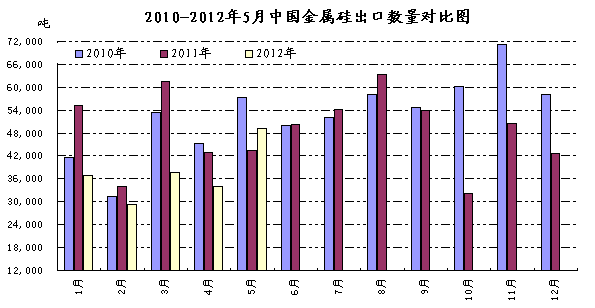 終端市場(chǎng)需求不給力,外銷也沒有傳來一絲好消息,從下述圖、表中可以看出,1-5月金屬硅出口累計(jì)約18.8萬噸,而2011年1-5月出口累計(jì)約23.7萬噸,相比而言,出口量下滑近5萬噸。