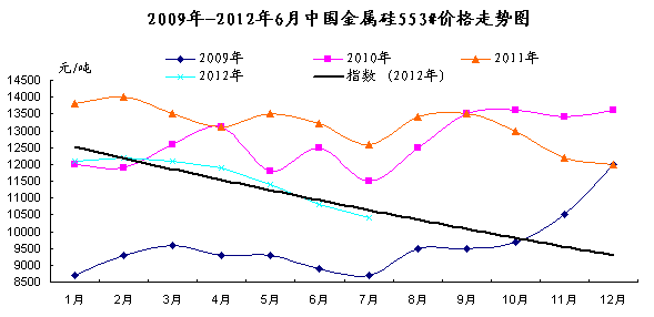 2012年,經(jīng)濟衰退愈演愈烈,下游各行業(yè)受到資金及需求等各方面因素,紛紛減產(chǎn)停產(chǎn),導致金屬硅需求銳減,553#金屬硅供給磨粉廠及鋁合金廠家使用居多,而磨粉廠所延伸的終端行業(yè)多晶硅大面積停產(chǎn),鋁合金行業(yè)也因市場需求不旺開工率下滑,加之進入豐水期后,各種低價貨不斷沖擊,貿(mào)易商壓價采購現(xiàn)象嚴重,照此行情來看,553#金屬硅直奔萬元大關而去。