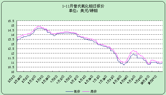 市場上沒有大量交易,價格在11美左右波動。一些市場參與者報價在11美元/磅鉬以上,也有一些報價在11美元一下,但是多數(shù)報價在11美元/磅鉬以上。