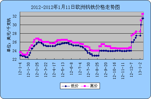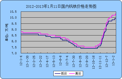 以下分別為2012-2013年1月11日國(guó)內(nèi)外釩鐵價(jià)格走勢(shì)圖: