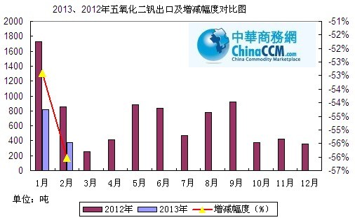 以下分別為2013、2012年五氧化二釩、釩鐵出口及增減幅度對(duì)比圖: