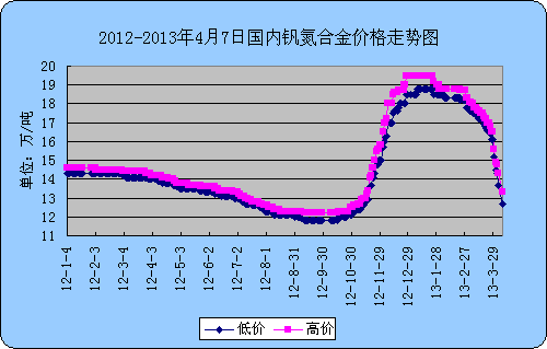 以下為:2012-2013年4月7日國內(nèi)釩氮合金價(jià)格走勢(shì)圖