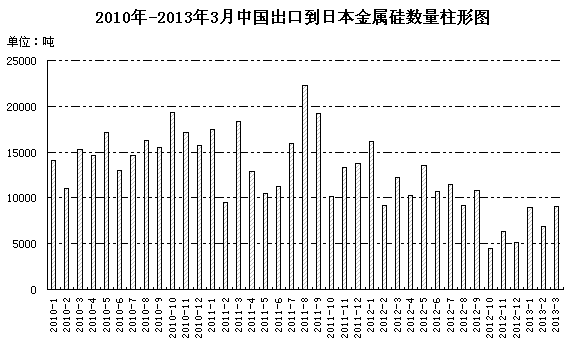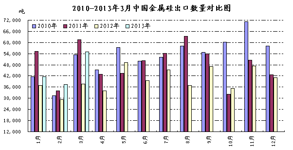 2013年3月中國金屬硅(28046900)出口量約為5.49萬噸,環(huán)比2013年2月的3.73萬噸增長47.31%;同比2012年3月份的3.77萬噸增加45.61%。