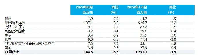 2024年8月全球71個(gè)納入世界鋼鐵協(xié)會統(tǒng)計(jì)國家的粗鋼產(chǎn)量為1.448億噸,同比下降6.5%。