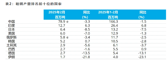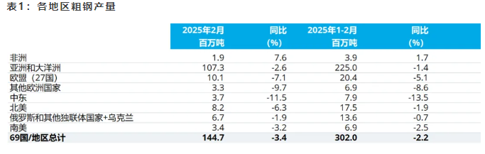 2025年2月全球69個(gè)納入世界鋼鐵協(xié)會統(tǒng)計(jì)國家/地區(qū)的粗鋼產(chǎn)量為1.447億噸,同比下降3.4%。