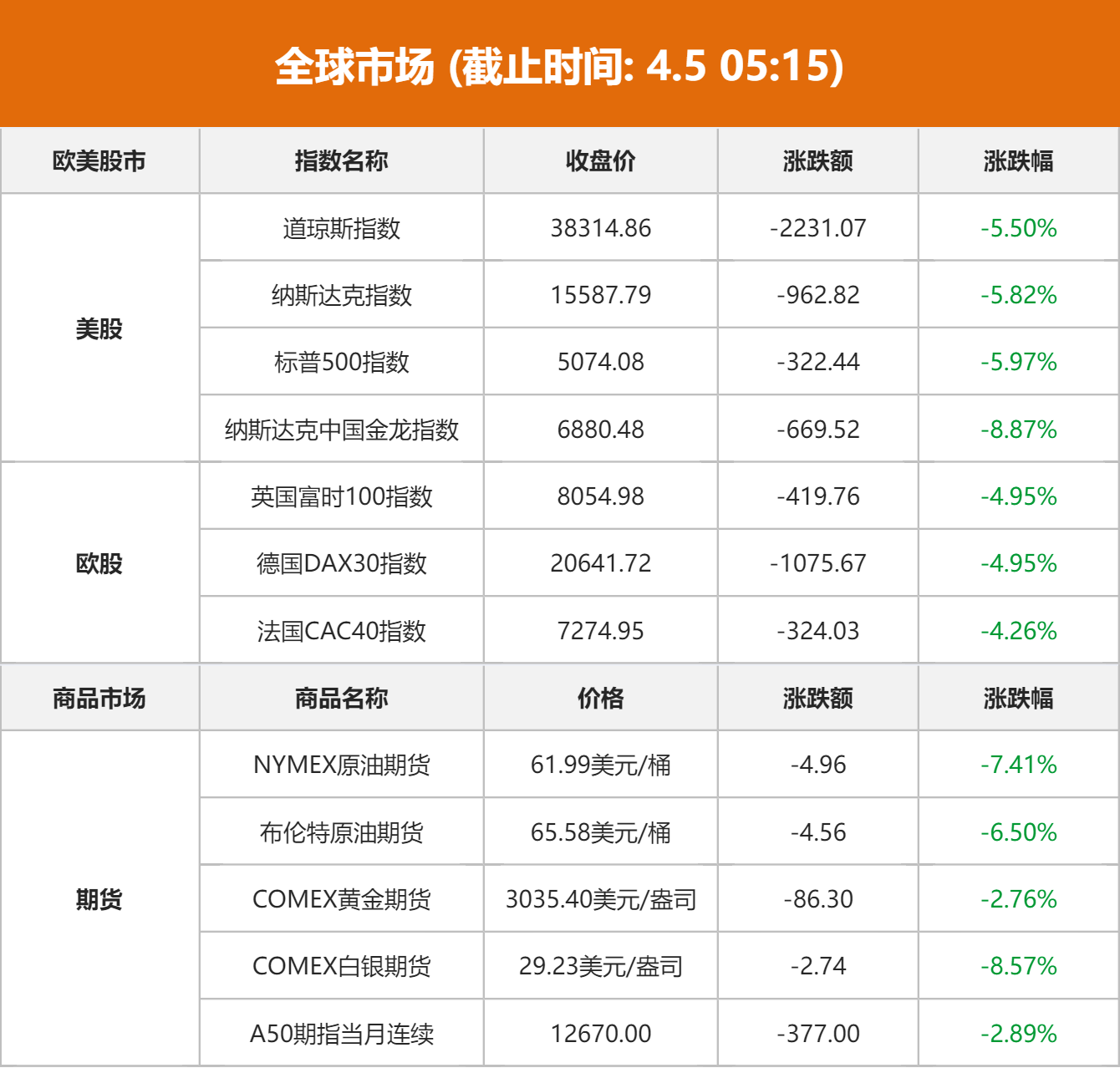 美股市場(chǎng):紐約股市三大股指4日繼續(xù)大幅下跌,道指失守40000點(diǎn)關(guān)口,納指、標(biāo)普跌近6%,納指進(jìn)入技術(shù)性熊市(從近期高點(diǎn)下跌超20%)。截至當(dāng)天收盤,道瓊斯工業(yè)平均指數(shù)比前一交易日下跌2231.07點(diǎn),收于38314.86點(diǎn),跌幅為5.50%;標(biāo)準(zhǔn)普爾500種股票指數(shù)下跌322.44點(diǎn),收于5074.08點(diǎn),跌幅為5.97%;納斯達(dá)克綜合指數(shù)下跌962.82點(diǎn),收于15587.79點(diǎn),跌幅為5.82%。本周,道指累跌7.86%,納指累跌10.02%,標(biāo)普500指數(shù)累跌9.08%。消息方面,美國(guó)總統(tǒng)特朗普表示,這將是美聯(lián)儲(chǔ)主席鮑威爾降息的最佳時(shí)機(jī)。美聯(lián)儲(chǔ)主席鮑威爾表示,美國(guó)關(guān)稅可能導(dǎo)致通脹上升、經(jīng)濟(jì)增長(zhǎng)放緩,美國(guó)失業(yè)風(fēng)險(xiǎn)上升。鮑威爾表示,在關(guān)稅問題上,調(diào)整貨幣政策“為時(shí)過早”。