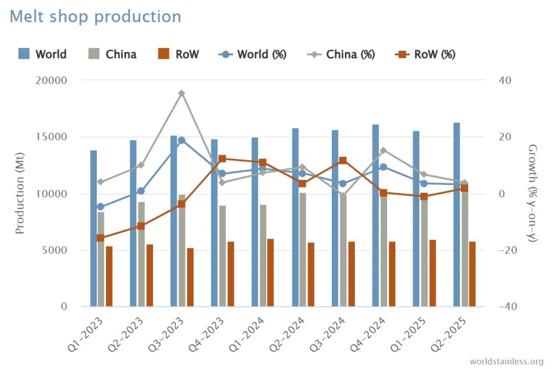 世界不銹鋼協(xié)會發(fā)布的2025年第二季度的數(shù)據(jù)表明,前六個月的不銹鋼粗鋼產(chǎn)量為3190萬噸。