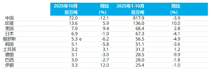 2025年10月全球70個(gè)納入世界鋼鐵協(xié)會(huì)統(tǒng)計(jì)國(guó)家/地區(qū)的粗鋼產(chǎn)量為1.433億噸,同比下降5.9%。