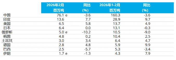 2026年2月全球69個(gè)納入世界鋼鐵協(xié)會(huì)統(tǒng)計(jì)國(guó)家/地區(qū)的粗鋼產(chǎn)量為1.418億噸,同比下降2.2%。
