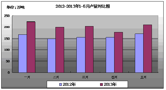以下是2012、2013年1-5月石油焦產(chǎn)量對比圖: