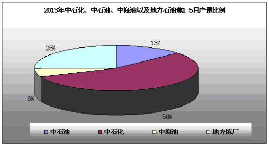 在2013年1-5月石油焦總產(chǎn)量中,中石油石油焦產(chǎn)量為136.15萬噸,中石化石油焦產(chǎn)量為564.54萬噸,中海油石油焦產(chǎn)量為61.4萬噸,地方煉廠石油焦產(chǎn)量為258.55萬噸。