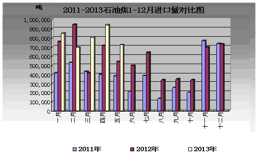 以下是2011-2013年石油焦1-5月進(jìn)口量對比圖: