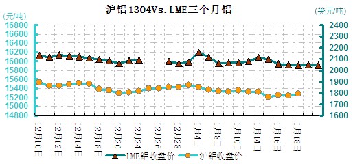 圖一 滬鋁1304VSLME三個(gè)月鋁對(duì)比走勢(shì)圖