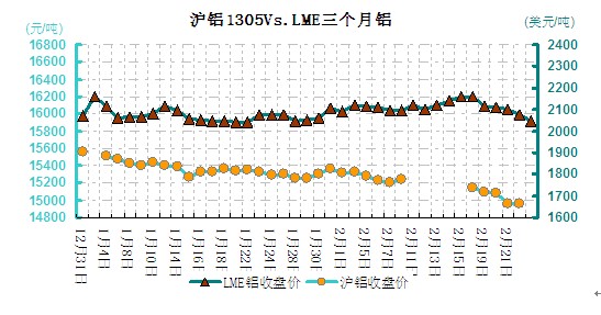 圖二 滬鋁1304VS現(xiàn)貨鋁價(jià)對比走勢圖