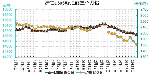 圖一 滬鋁1305VSLME三個(gè)月鋁對(duì)比走勢(shì)圖