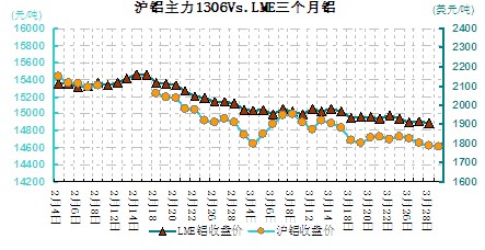 本周(3.25-3.29)鋁價繼續(xù)走低,市場利好消息不多,歐元區(qū)經(jīng)濟依舊低迷,塞浦路斯救助協(xié)議對市場的影響仍在繼續(xù)。從鋁市基本面來看,目前市場需求好轉(zhuǎn)的跡象并未顯現(xiàn),盡管現(xiàn)已有部分鋁廠開始減產(chǎn),或許對目前供應(yīng)過剩的現(xiàn)狀有所改善,不過總體減產(chǎn)量并不大,且新疆地區(qū)新增產(chǎn)能也較多,對鋁價提振作用不大。從周均價看,LME倫鋁環(huán)比下跌0.1.1%,滬鋁主力合約環(huán)比下跌0.2%。