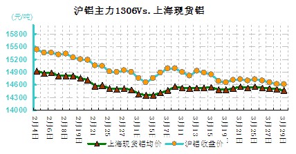 圖二 滬鋁主力VS現(xiàn)貨鋁價對比走勢圖