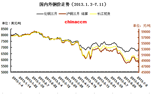 伯南克暗示加息遙遙無期,客觀上緩解了市場擔(dān)憂情緒,短期期銅反彈將延續(xù)到下周。重點關(guān)注下周一中國將公布第二季度宏觀數(shù)據(jù),中國能否出臺新的政策成為市場關(guān)注的焦點。三季度后銅消費將進(jìn)入淡季,需求也不會有較大起色。因此,中長期看,我們依然認(rèn)為銅價不具備逆轉(zhuǎn)的條件,后市仍以弱勢調(diào)整格局為主。