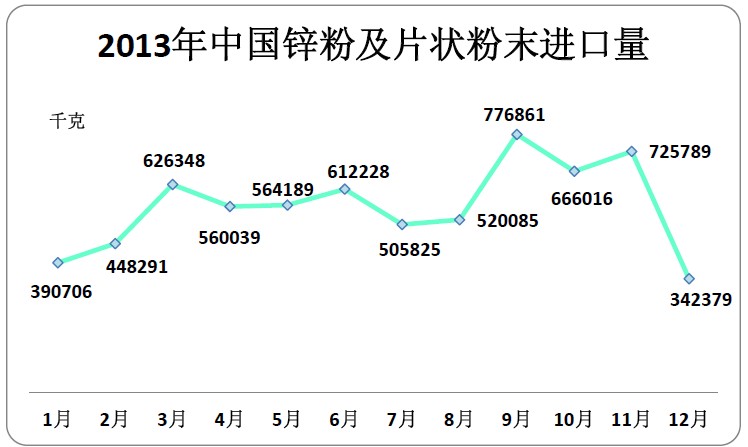 下圖是2013 年1-12 月中國鋅粉及片狀粉末進口量:
