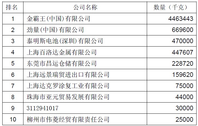 2013 年9 月鋅粉進口量達到峰值776861 千克,12 月份進口量僅342379 千克,主要是12月份中國主要鋅粉進口企業(yè)—金霸王(中國)有限公司因檢修等原因減少鋅粉進口量。預(yù)計2014 年鋅粉及片狀粉末進口量將明顯增加,主要是勁量(中國)有限公司于去年12 月份釋放了新建的電池產(chǎn)能。