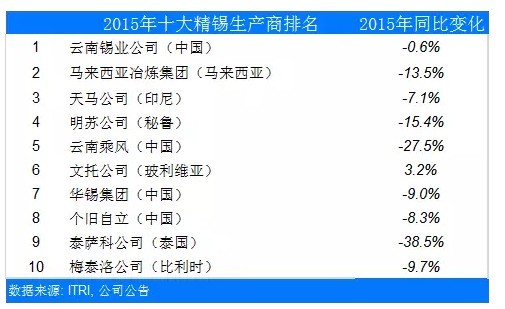 國(guó)際錫業(yè)協(xié)會(huì)(ITRI)匯總了2015 年全球主要生產(chǎn)商的產(chǎn)量。在已報(bào)告數(shù)據(jù)的十家公司中,九家公司均表示去年產(chǎn)量有所下滑,其中包括四大錫生產(chǎn)商。所收集的大部分?jǐn)?shù)據(jù)都是各家企業(yè)向國(guó)際錫協(xié)直接報(bào)告的數(shù)據(jù),同時(shí)包含個(gè)別公開發(fā)布的信息。